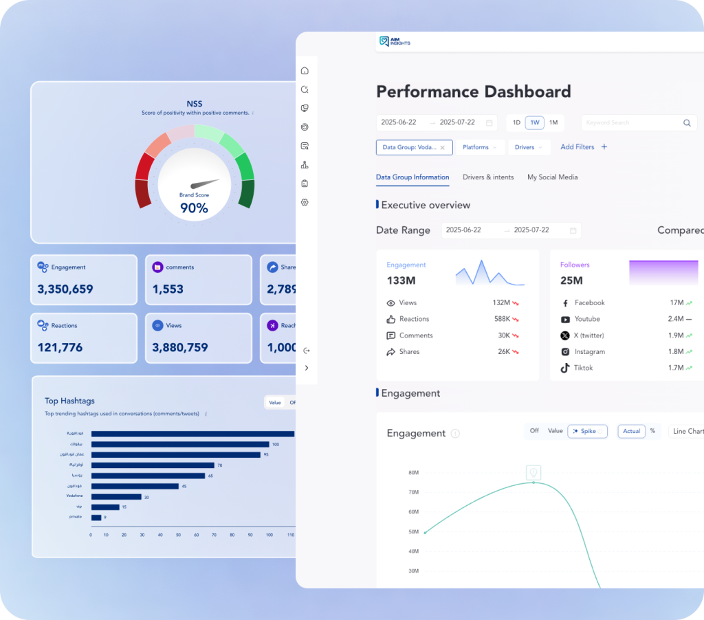 Assessment of the brand's perception through Net Sentiment Score (NSS), along with analysis of natural language interactions and identification of sentiment trends.