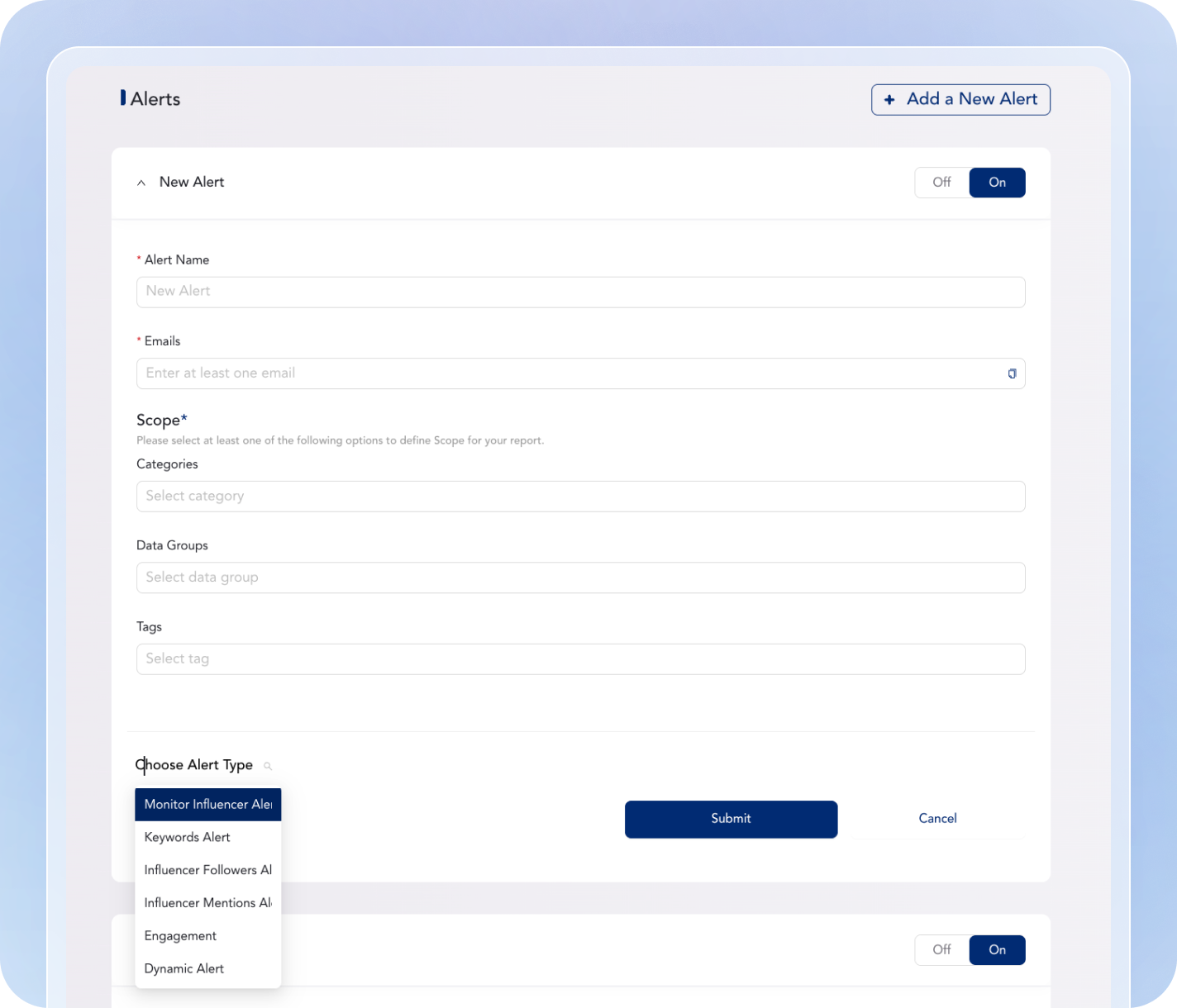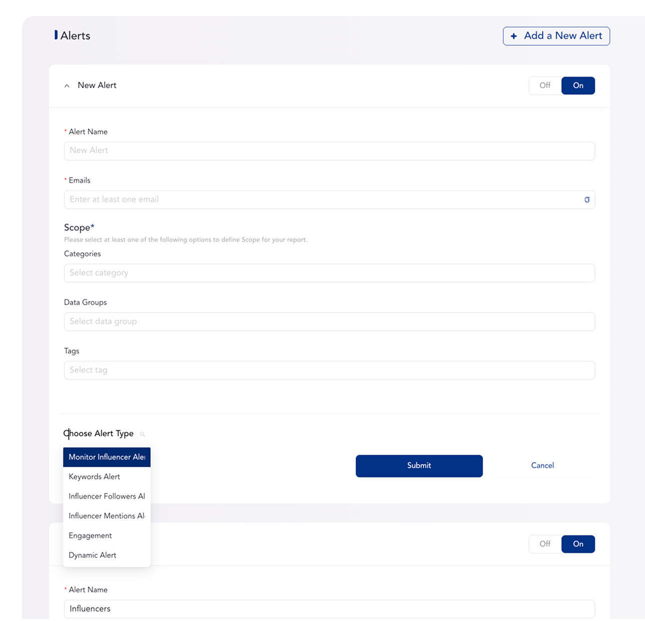 Personalized alert settings within the dashboard enable monitoring of specific keywords and phrases, with various alert types including Keyword Alerts, Influencer Alerts, Influencer Followers Alerts, and Influencer Mentions Alerts.
